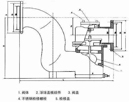 F43X-1.0T防逆水封阀主要由带存水弯的阀体及浮球盖板组件等组成,带浮球的盖板盖在阀体的密封阀座上,将阀腔分成内外两部分,内腔为清水部分,外腔通排水管道,当内腔充满清水时.因位于内腔的浮球作用,盖板压力降低,易于开启通流。溢流停止后,盖板可白行复位.盖严阀座,从而可严格阻断臭气及污水倒灌。